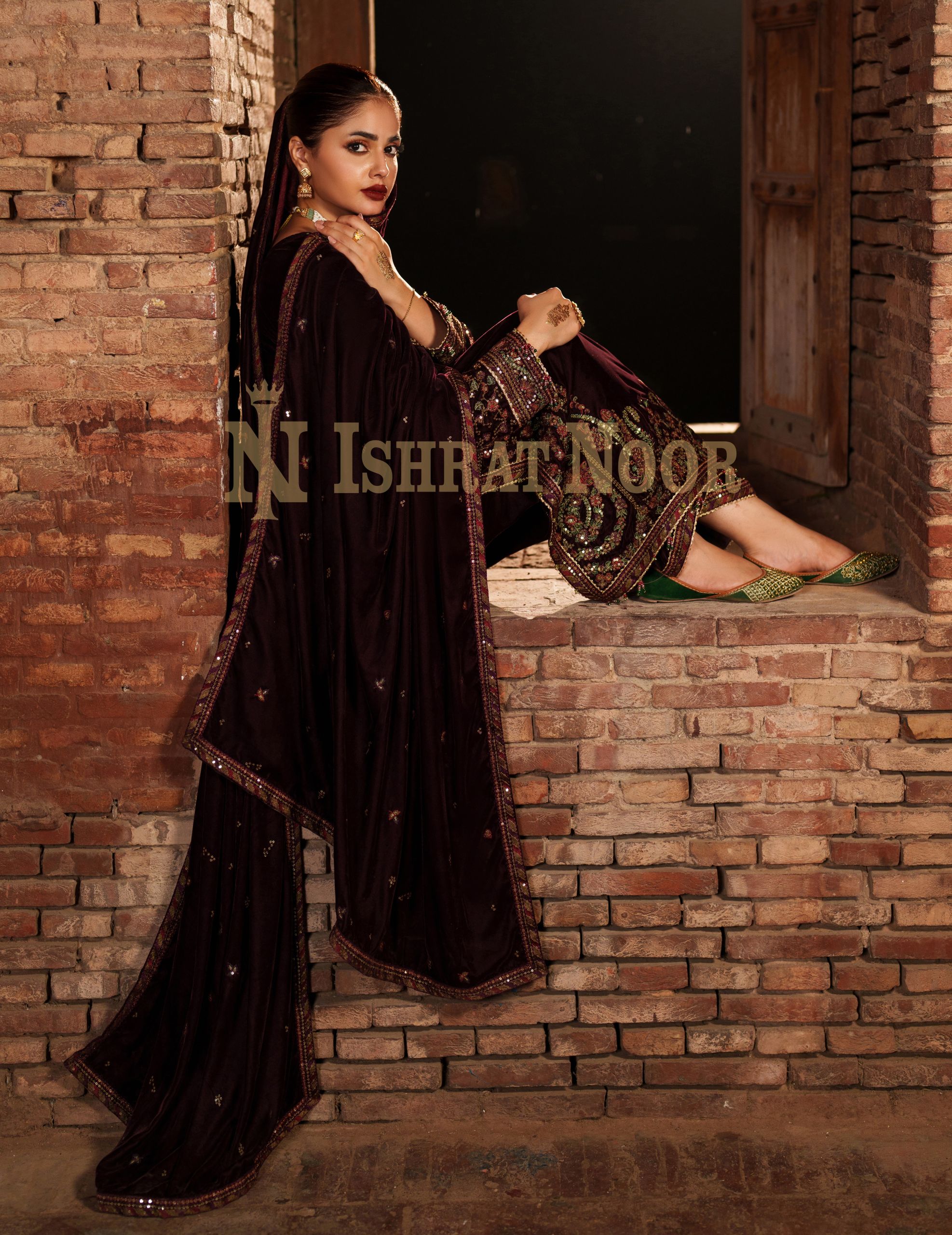 Matching dupatta featuring zari-lined patterns and embroidered borders for an opulent touch.